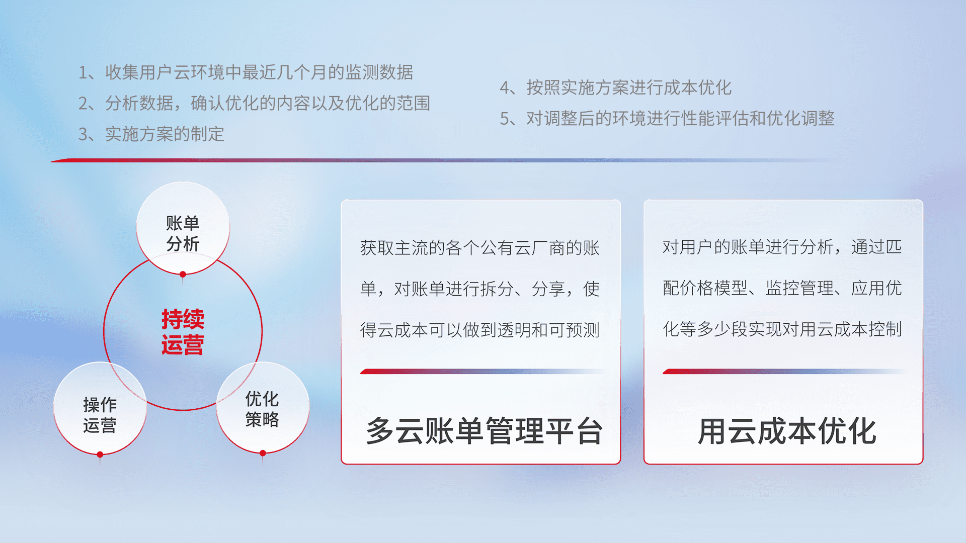 通过多云纳管,,以统一的资源数据模型把客户的云资源进行抽象和封装,,,,进而实现对多云资源的统一操作,,,保障云资源管理的可靠性、、稳定性与可用性。。量身定制化运维内容,,配置、、开发运维、、补丁管理、、、备份、、、监控、、认证和访问管理、、、审计和日常巡检等,,保障在用云过程中的可靠度,,,稳定度以及高可用率。。